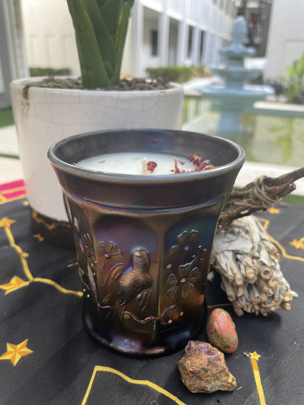 This iridescent purple vintage bird mug vessel houses a coco apricot wax candle hand poured in Austin, TX by AG Candles. The Virgo fragrance and vintage vessel were curated by Mak Jagger Tarot. This candle is estimated to burn for 60 hours.